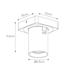 Deze 1 lichts spot is eventueel ook geschikt om aan de wand te monteren. De cilinder heeft een diameter van 6,5 cm en een lengte van 8 cm. De totale hoogte is 11,5 cm en de breedte van de plafondplaat is 10 cm. Kleur: Mat-goud i.c.m zwarte accenten.