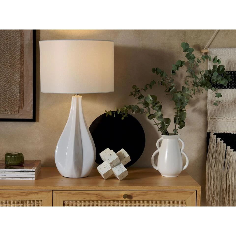 Tafellamp in lichtbeige. Of je de tafellamp nu gebruikt als sierverlichting in de woonkamer, als praktische leeslamp in de studeerkamer of als handige bedlamp in de slaapkamer, het is altijd een elegante en verrassende verschijning in de ruimte. De lamp heeft een eigentijds design, met een glanzende uitstraling en warme verlichting.