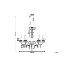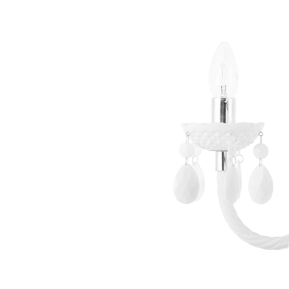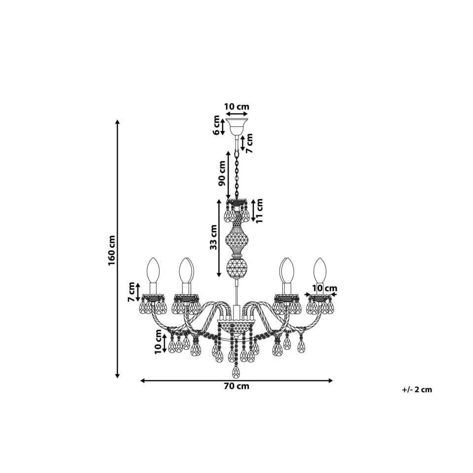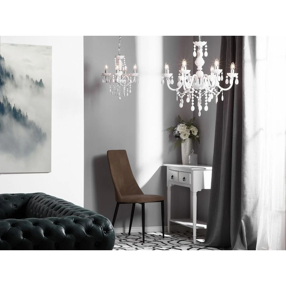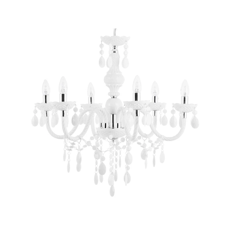 Kroonluchter met sprankelende kristallen elementen. Qua sierlijkheid is deze betoverende kroonluchter moeilijk te verslaan. De zes gebogen lichtarmen van wit plastic zijn uitgerust met sprankelende kristallen elementen, die mooie lichteffecten bieden. Zonnestralen en kaarslicht worden weerspiegeld in de decoratieve elementen en omhullen de kamer in warm licht. Een hoogtepunt voor alle klassieke en elegante interieurs. De lamp is voorzien van een transparante kabel en robuuste kettingophanging.