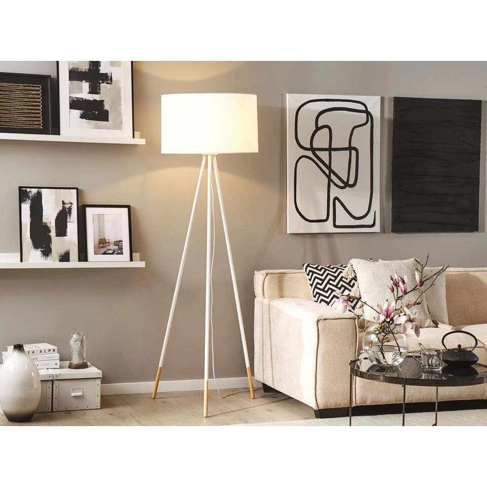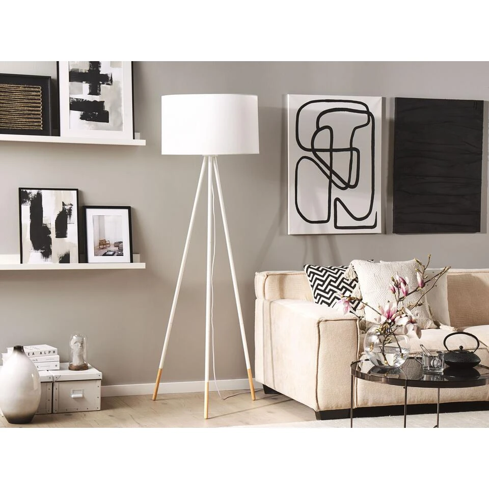 Trendy vloerlamp met driepoot. Helder licht ontmoet trendy design. De vloerlamp straalt een heldere, vriendelijke sfeer uit. De ronde, witte lampenkap van hoogwaardige stof rust op een driebenig frame van licht hout. Charmant ontwerp en en helder licht.