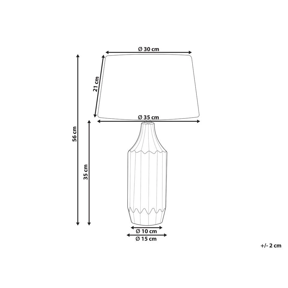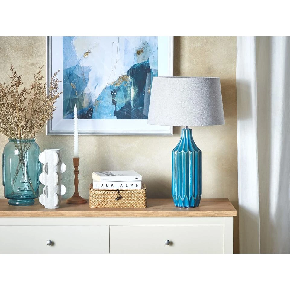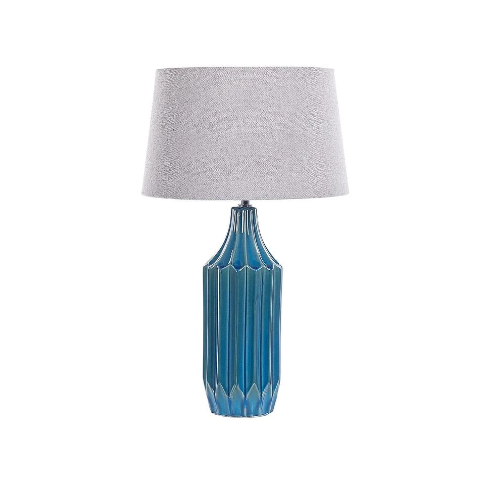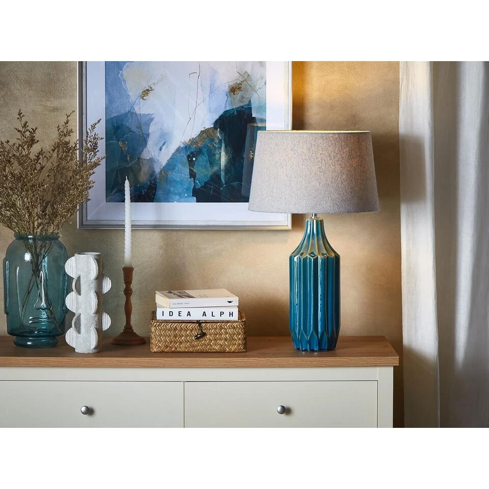 Geribbelde keramische tafellamp. Deze groenblauwe tafellamp is een elegante aanvulling op elk nachtkastje of dressoir. Ontworpen met een mooie geribbelde basis, is het een functioneel en decoratief accent voor elke kamer in je huis. De glanzende basis in combinatie met een beige linnen-achtige lampenkap zorgt ervoor dat je de lamp gemakkelijk in aan elke ruimte kan toevoegen.