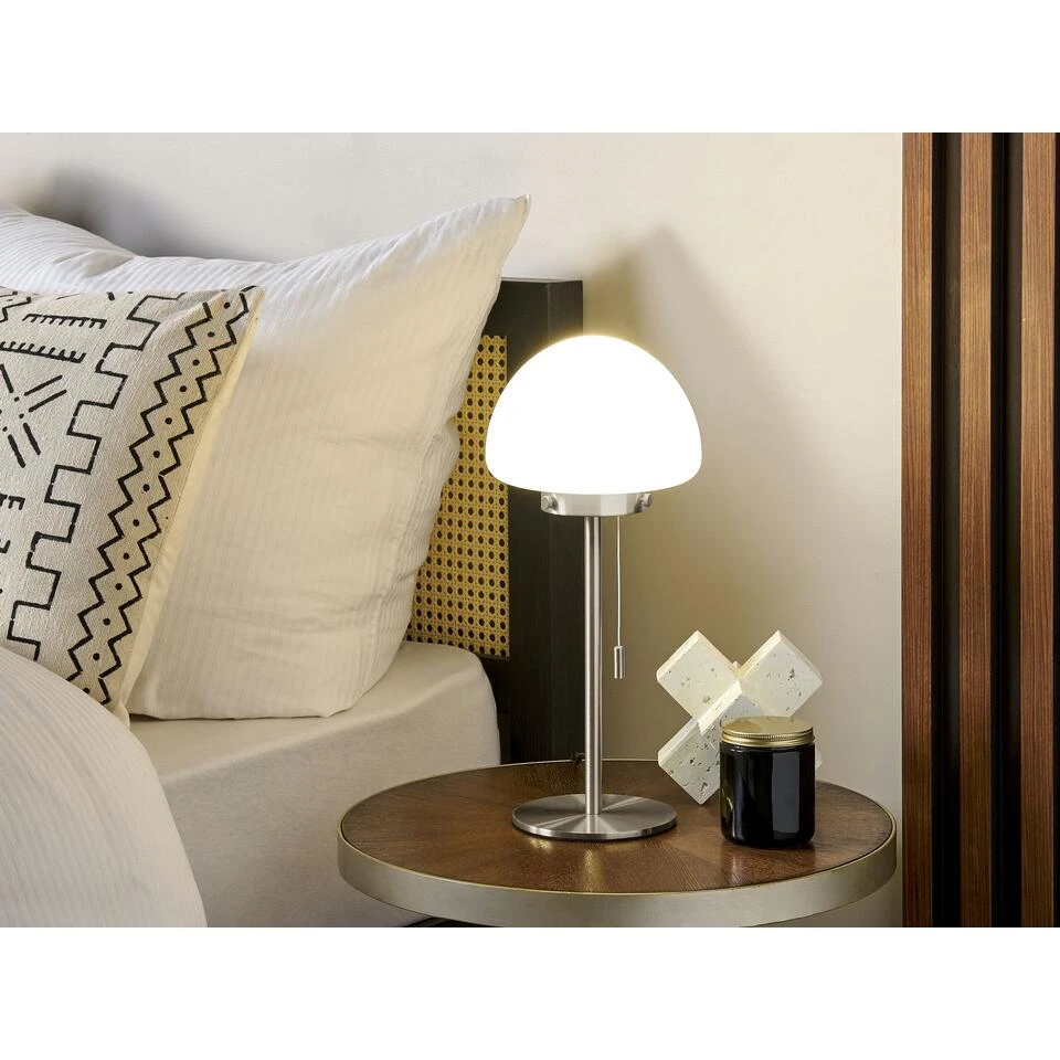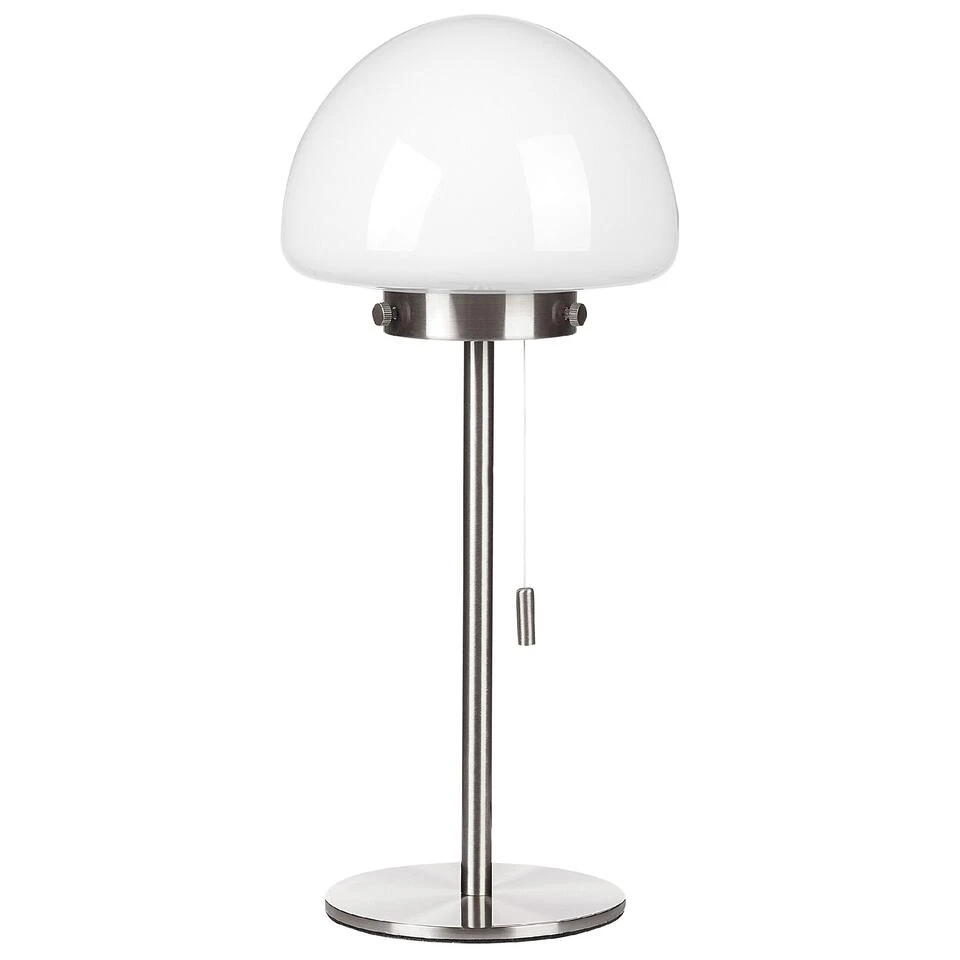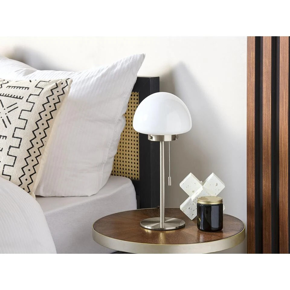Minimalistische bureaulamp met trekkoord. Geef je interieur een upgrade met deze opvallende tafellamp. Het stuk heeft een half ronde glazen lampenkap in wit en heeft een zilveren basis die zeker zal opvallen en past in veel verschillende slaapkamers, woonkamers en werkkamers in retro, hedendaagse en moderne stijl. De lamp is gemakkelijk aan en uit te zetten dankzij het trekkoord.