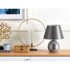 Stijlvolle, zilverkleurige tafellamp . Deze elegante tafellamp betovert iedere ruimte. De fijne lamp van zilverkleurig kunstzijde vult de ruimte met een aangenaam licht. De stabiele voet van de woonkamerlamp is met fijne, verticale en horizontale lijnen versierd. Laat ook jouw huis betoveren door deze sierlijke tafellamp.