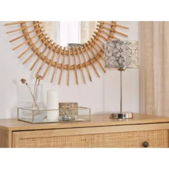 Tafellamp met bloemenpatroon. Deze speelse tafellamp van nikkelkleurig metaal is een echt hoogtepunt. De klassieke, smalle lampvoet en de ronde kap in een bloemige look geven de lamp een glamoureuze touch. De sprankelende strass steentjes vormen kleine, lichtgevende bloemen die elke ruimte laten schitteren. De decoratieve tafellamp ademt een gezellige sfeer uit en mengt zich in vele interieurstijlen, romantisch, modern of klassiek.