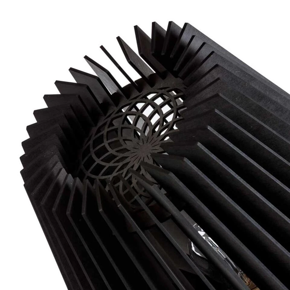 Deze leuke tafellamp van hout geeft een mooi effect door het licht wat door de houten latjes probeert te ontsnappen. Dit model is leverbaar in 2 maten en dit is de grootste maat. Geschikt voor een E27 lichtbron van maximaal 25 Watt (excl.). Deze Corner tafellamp is 32 cm breed en de kap is in totaal 36 cm hoog. Wordt geleverd met zwart snoer incl. een snoerschakelaar. Kleur: zwart gekleurd hout.