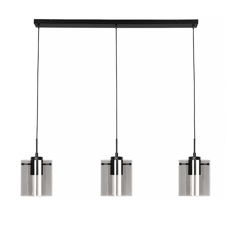 Deze lange hanglamp is geschikt voor 3x GU10 LED lichtbronnen (excl.) die subtiel gericht licht door het rook glas laten schijnen. Hierdoor onstaat er een apart en sfeervol effect. Het metaal is mat zwart gespoten en in samen met het donkere rook glas een perfecte combinatie. De glazen hebben een doorsnede van 15 cm en de hoogte is 20 cm. De totale lengte is 100 cm en de balk heeft een breedte van 10 cm. De hoogte is maximaal 150 cm maar simpel in te korten. Kleur: mat zwart i.c.m rook glas.