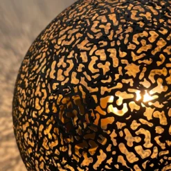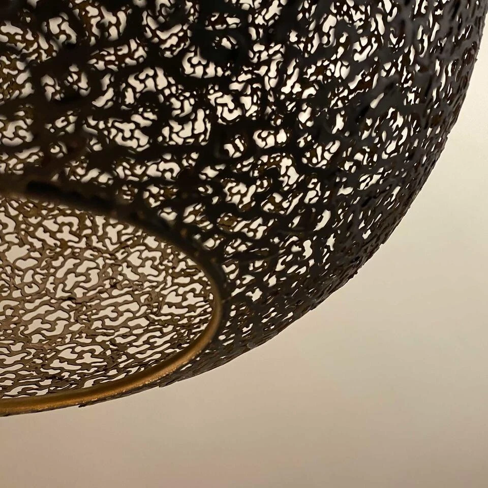 Leuke opengewerkte oosterse hanglamp van Freelight die gemaakt is in een zwarte kleur. Het metaal van deze Oronero hanglamp is gevormd in een speciaal patroon waardoor er een apart licht spektakel ontstaat als de lamp aangezet wordt. Deze hanglamp is gemaakt in een bol vorm en aan de onderkant bevindt zich een opening. Het aparte van deze Oronero serie is de kleur: de buitenzijde is zwart en de binnen kant van de bol is mat-goudkleurig gespoten.