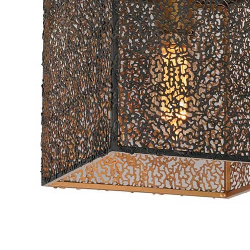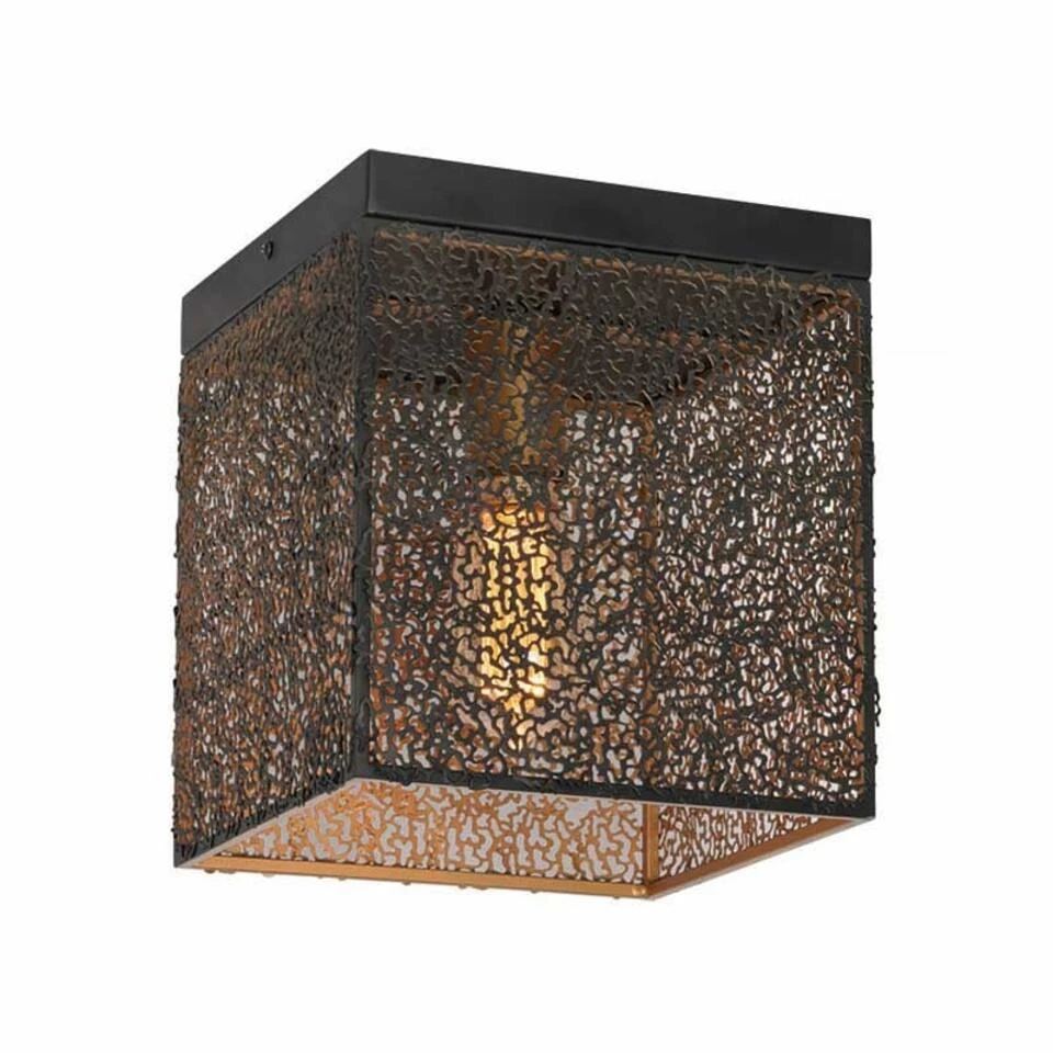 Leuke opengewerkte strakke oosterse plafondlamp van Freelight die gemaakt is in een zwarte kleur. Het metaal van deze Avola hanglamp is gevormd in een speciaal patroon waardoor er een apart licht spektakel ontstaat als de lamp aangezet wordt. Deze plafondlamp is gemaakt in een kubisch vorm met een open onderkant. Het aparte van deze Avola serie is de kleur: de buitenzijde is zwart en de binnenkant (en de fitting) is mat-goudkleurig gespoten.
