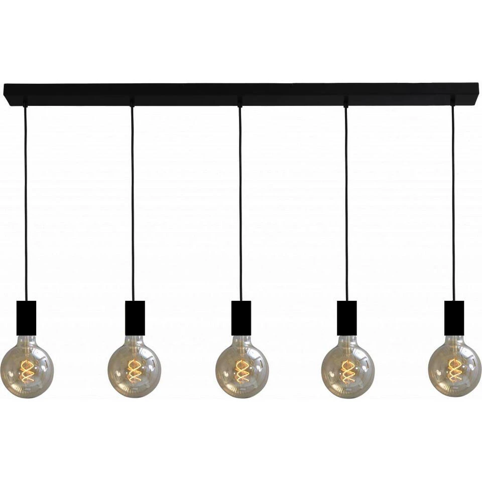 Hanglamp Bulby 5-lichts is een gave sobere lamp, die je naar eigen inzicht op kunt hangen. De lamp bestaat uit een mooie strakke zwart metalen montageplaat met 5 stoffen snoeren. Deze snoeren zijn gemakkelijk in te korten. Wilt u alle lichtbronnen op gelijke hoogte of juist een speelse uitstraling met verschillende lengtes? Het kan allemaal!