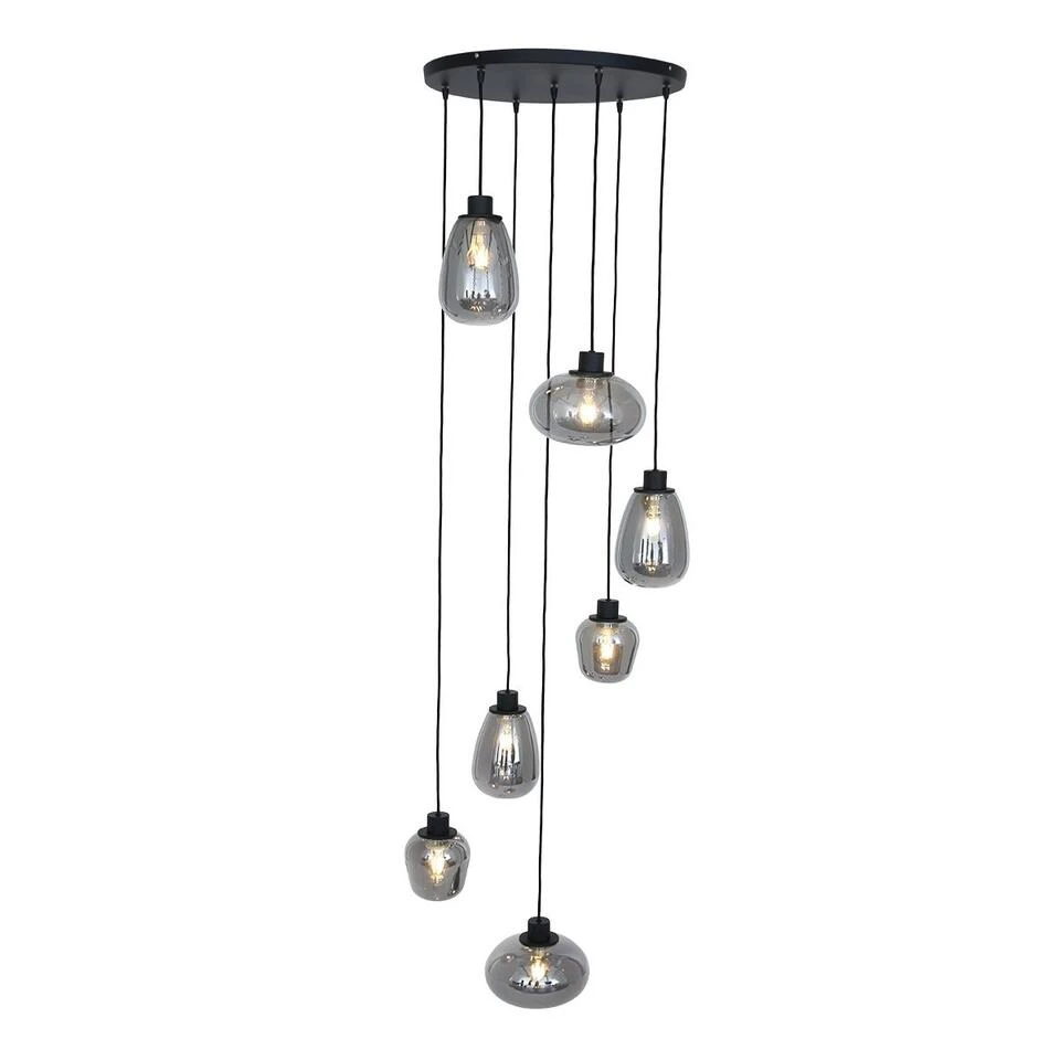 Deze gezellige ronde Reflection hanglamp van leverancier Steinhauer is voorzien van 7 glazen die een rook kleurige coating hebben. Deze lamp heeft 3 verschillende soorten kelken met een diameter van 14-22 cm en een hoogte van 17-23 cm. De totale hoogte van dit armatuur is instelbaar maar maximaal 150 cm, de plafondplaat heeft een doorsnede van 50 cm.