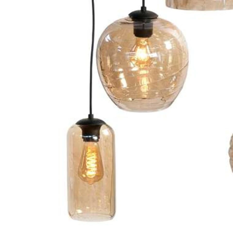 De Fantasy hanglamp van leverancier Highlight is voorzien van 6 glazen die een amber kleurige coating hebben. Deze lamp heeft 5 verschillende soorten kelken met een diameter van 12-20 cm en een hoogte van 18-25 cm. De totale hoogte van dit armatuur is instelbaar maar maximaal 130 cm, de plafondplaat heeft een lengte van 100 cm en een breedte van 35 cm.