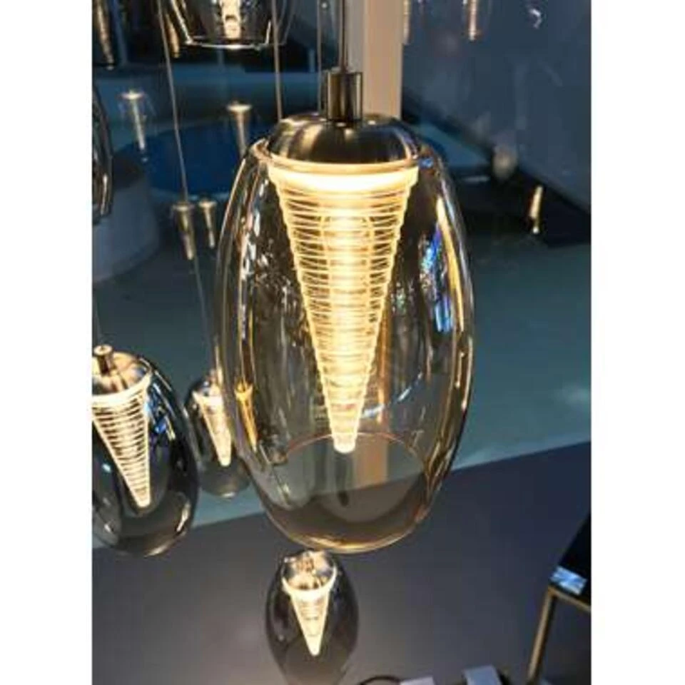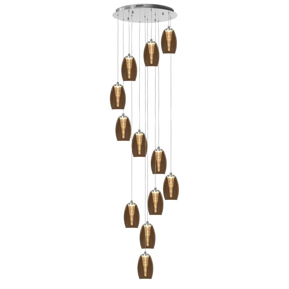De 12 kelken hebben ieder een LED module van 5 Watt en deze geven bij elkaar 2000 Lumen aan warm wit licht (2700 Kelvin). De diameter van deze grote vide lamp is 50 cm en de diameter van de kelken is 10 cm. De totale hoogte is maximaal 340 cm. Kleur: Mat-chroom metaal met zacht amber kleurig glas.