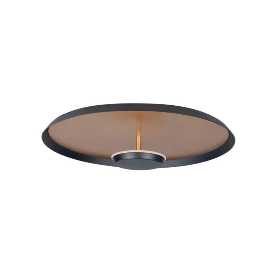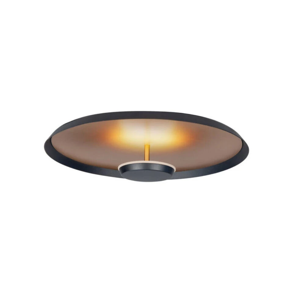 Deze kleine plafondlamp van leverancier Highlight verbruikt 8 watt en geeft 720 Lumen aan mooi warm wit licht (2700 Kelvin). De diameter is 25,5 cm en de hoogte is 9,5 cm. Kleur: mat-zwart icm mat-goud.
