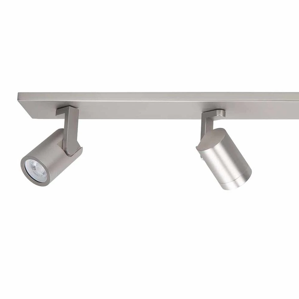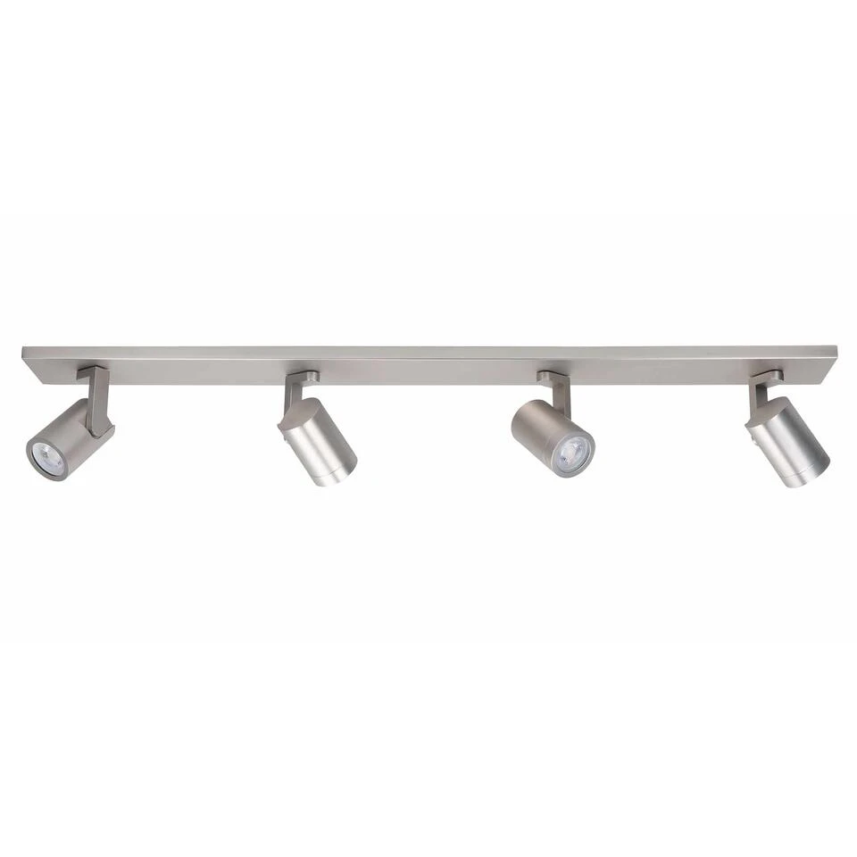 De cilinders van deze langwerpige 4 lichts spot hebben een diameter van 5,8 cm en een lengte van 8,5 cm. De plafondplaat is mooi plat en heeft een hoogte van 1,5 cm. De totale hoogte is 16 cm en de breedte van de plafondplaat is 9,5 cm, de lengte van de plaat is 91,5 cm. Kleur: Mat-chroom.