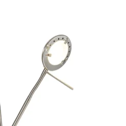 Aan de stang bevinden zich 2 draai dimmers waarmee beide lampen apart en traploos te dimmen zijn. Onder de grote schaal bevindt zich een klein wit glaasje die zorgt voor een sfeervol lichtje naar beneden. De totale hoogte van dit armatuur is 180 cm en de zijarm heeft een lengte van 50 cm. Kleur: mat-chroom. Deze lamp is een bouwpakket en is simpel te monteren.