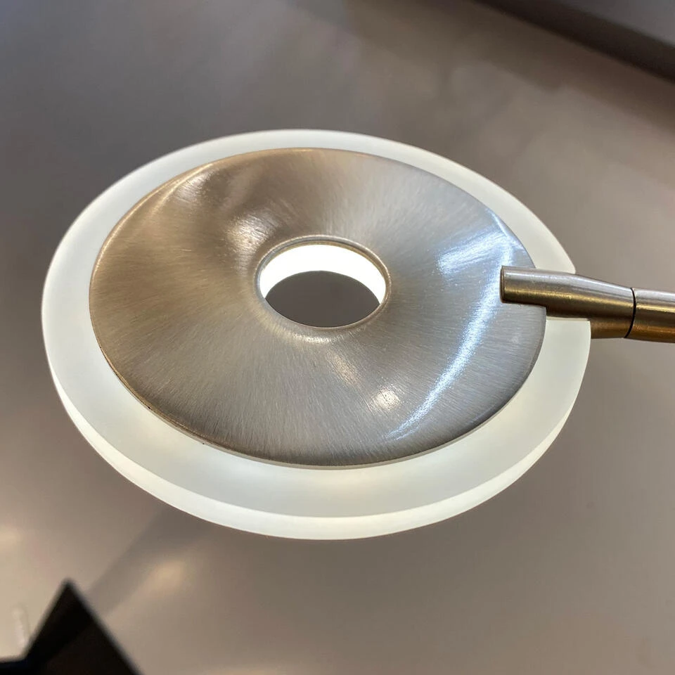 Functionele leeslamp die is voorzien van 2 armen met ieder een mat glaasje waarin de (niet vervangbare) LED lampen in zitten. Op het armatuur bevinden zich 2 druk dimmers om elke arm apart te dimmen en met dezelfde drukknop is ook de lichtkleur in te stellen in 3 stappen (van 2700 tot 4000 Kelvin). Hierdoor kan de lamp dus mooi sfeerlicht kan geven maar ook fel koelwit leeslicht. Deze lamp verbruikt 2x 6,5 Watt en geeft 2x 585 Lumen aan licht.