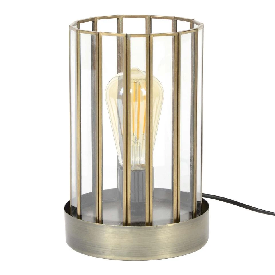 Deze cilindervormige tafellamp is voorzien van diverse verschillende plaatjes met daartussen glas verwerkt. Deze onderdelen worden stuk voor stuk met de hand gemaakt en vervolgens aan elkaar gesoldeerd. Het glas zorgt voor een zeer sfeervolle lichtuitstraling van de lampenbol, welke tevens goed zichtbaar is. Het staal is afgewerkt met een brons antiek finish. Er wordt aanbevolen LED lichtbron (8450) te gebruiken.