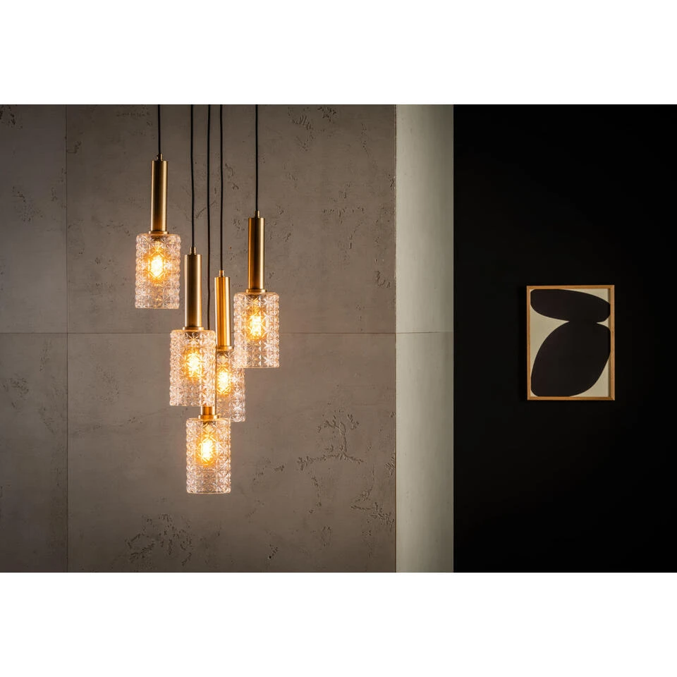 Een traditioneel ontwerp in een nieuw jasje. Coralie is een luchter met een tijdloos effect in ieder type interieur. Vanuit de plafondplaat dalen 5 lichtpunten naar beneden. Deze zijn in hoogte verstelbaar en beschikken elk over een ronde, glazen lampenkap met een klassiek motief. Deze hanglamp is een elegante aanwezige in de ruimte. Hij komt perfect tot zijn recht in een warme eetkamer of in een majestueuze inkomhal. Sluit aan op een dimmer voor de gewenste sfeer op ieder uur van de dag.