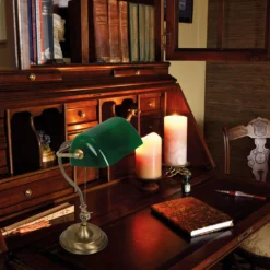 Klassieke tafellamp / bureaulamp afkomstig uit de Belana serie van Mexlite. Het design, het groene glas en de bronzen voet zijn de aspecten die deze Belana de perfecte klassieke bureaulamp maken. Het grote pluspunt is dat de lamp inclusief lang snoer van 165 centimeter geleverd wordt. De grote E27 fitting maakt het mogelijk dat alle lichtbronnen tot maximaal 40 Watt geschikt zijn.