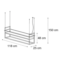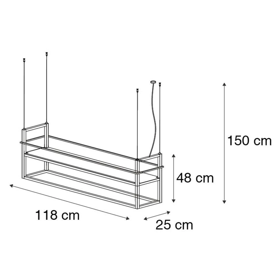 Hoe handig en gaaf is deze Cage Rack waarin je opbergruimte met sfeerverlichting kunt combineren? Superhandig en stijlvol boven je kookeiland om je kruiden neer te zetten of boven de eettafel om mooie planten op te zetten. Naast de functionaliteit is het ook nog eens een erg mooie hanglamp om te zien met haar strakke vormgeving! Let op: het maximale gewicht van de Cage hangt af van de stevigheid van je plafond! Het is goed als je dat op voorhand controleert, want de lamp weegt 9 kg. De Cage Rack is 118 cm lang, 25 cm breed en verstelbaar in hoogte van maximaal 150 cm tot minimaal 80 cm. Je maakt deze hanglamp compleet met vier E27 lichtbronnen van elk maximaal 60 Watt. De hanglamp is dimbaar met een externe dimmer. Lichtbronnen en dimmer zijn niet inbegrepen. Dus breng je sfeerverlichting of functioneel licht met Cage Rack? Het is allemaal mogelijk!