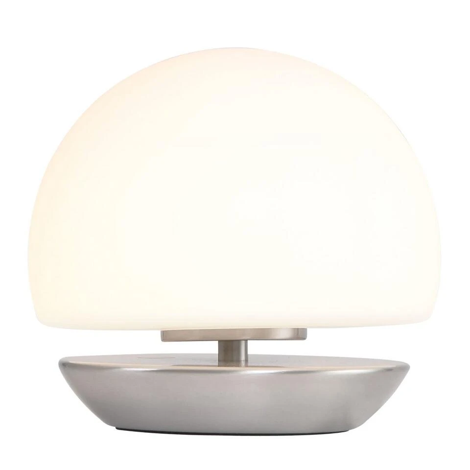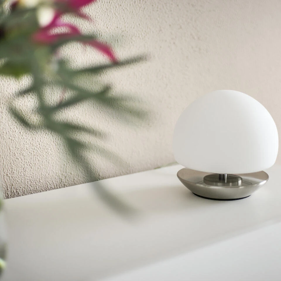 Staalkleurige tafellamp / bureaulamp met een touch dimmer. Schakelt zodra men het metaal aanraakt (4 standen). Ideaal als bedlamp. Wit glas (handwerk). Voorzien van een G9 fitting. Wordt inclusief LED lichtbron geleverd van 3 Watt (400, 2700 Kelvin) Uit de serie Ancilla LED. 7932ST. Oude nummer was 6875ST.