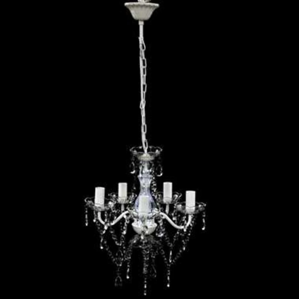 Deze hanglamp heeft een prachtig bewerkte centrale steel van kristalglas met gebogen acrylarmen, schansen en druppelkralen. Je kunt zowel gloeilampen als LED’s gebruiken.