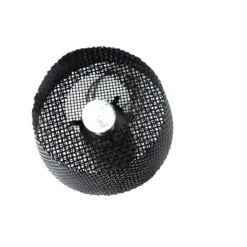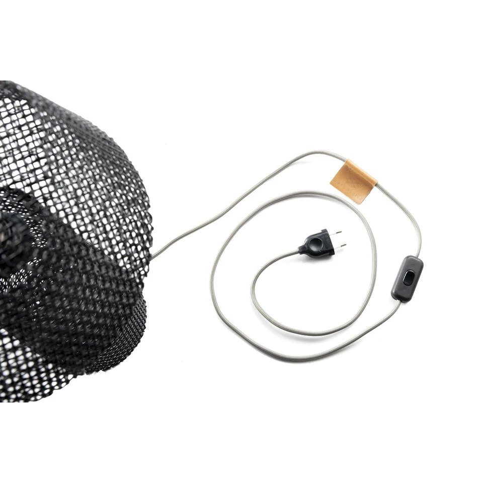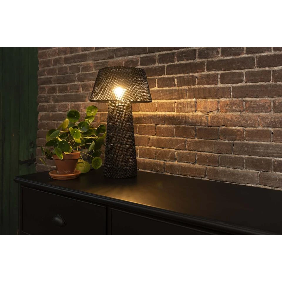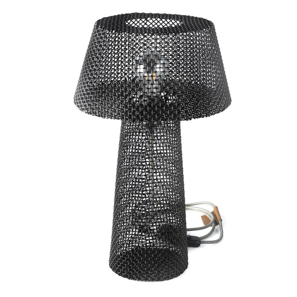 De vorm van de zwarte new vintage lamp werd geïnspireerd op de vintage mushroomlampen; een lange, ranke voet met een grote, brede lampenkap. De complete lamp werd uitgevoerd in geweven zwarte metaaldraden, wat hem zijn stoere, industriële look geeft. Uit is de zwarte lamp door haar rauwe materiaal al een mooi statement, maar het echte feest begint zodra je de industriële lamp aanzet. Het licht speelt met de geweven rvs draden en geeft een mooi lijnenspel op je muur, waardoor je hele interieur een toffe industriële touch krijgt.