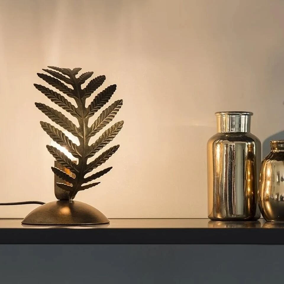 Leuke tropische tafellamp die is voorzien van 1 gebogen metalen blad. Dit kunstwerkje geeft gegarandeerd sfeer in elke ruimte. Ook prima te combineren met de andere armaturen uit de Palm familie.